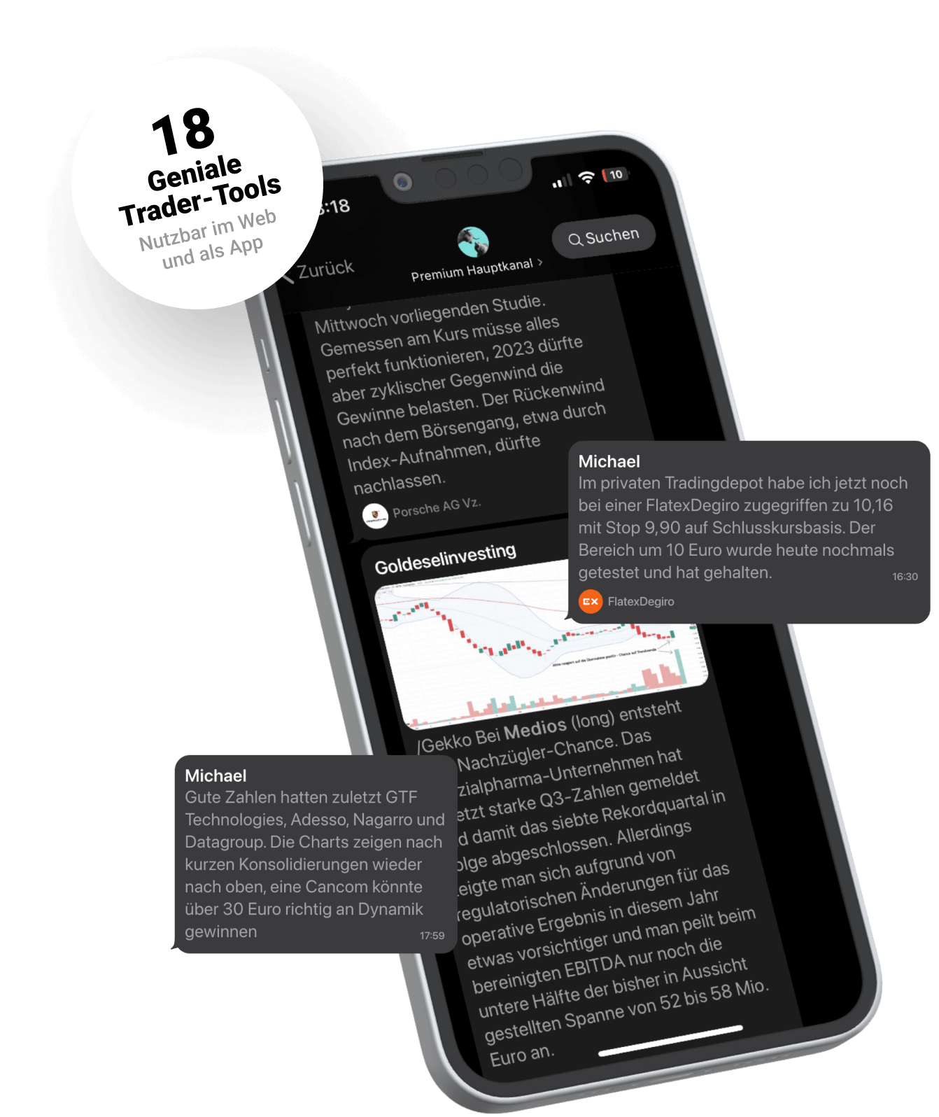 Seit 2020 ist Goldesel eine der führenden Plattformen für den aktiven Handel. Unser Team agiert seit vielen Jahren nachhaltig profitabel an der Börse. Goldesel steht nicht für den schnellen, kurzfristigen Erfolg, sondern für nachhaltig erfolgreiches Handeln. Mit unserer Erfahrung und Plattform wollen wir Dir helfen, deinen Weg an der Börse zu bestreiten. Unser Fokus: Trading, Community, Education.