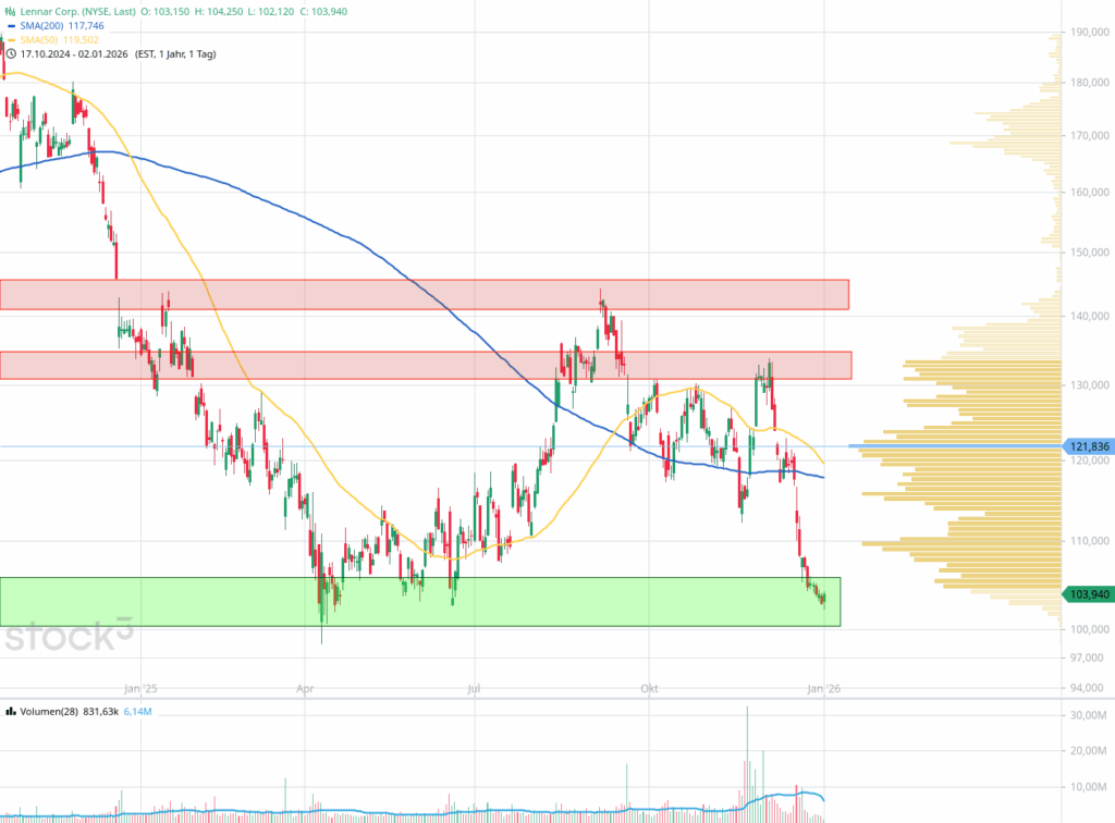 Lennar hat nach dem Einstieg des Orakels von Omaha nach einem kurzen Anstieg wieder in den Unterstützungsbereich zwischen 100 und 106 USD zurückgesetzt. Eine positive Reaktion in diesem Bereich mit einem Anstieg über 108,40 USD könnte eine erneute Gegenbewegung einleiten. Der RSI ist wieder deutlich überverkauft – auf dem Weg in Richtung Norden liegt allerdings auch viel Volumen, mit dem die Aktie zu kämpfen haben dürfte.