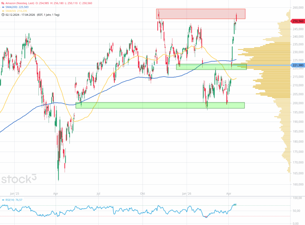Nach einer längeren und ausgedehnten Seitwärtsphase ist die Aktie von Amazon zuletzt wieder deutlich angestiegen und hat sich bis zum Allzeithoch zwischen 252 und 258,70 USD geschoben. Hier scheint die Aktie zunächst zu reagieren. Der RSI (76,57) ist bereits stark angestiegen. Ein Rücksetzer in Richtung 220 bis 225 USD (200-Tagelinie), könnte zum Einstieg genutzt werden. Ebenso wäre ein Ausbruch über das letzte Allzeithoch bei 258,70 USD spannend.