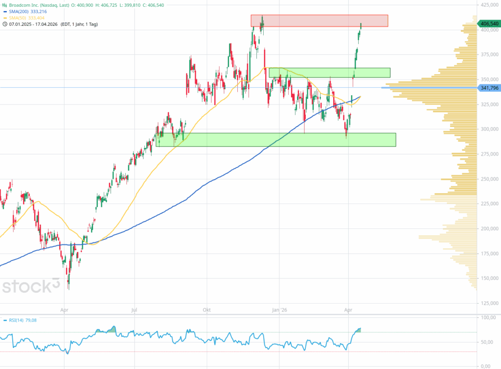 Die Broadcom-Aktie hat sich nach einer kleinen Korrektur ähnlich rasant erholt, wie der Nasdaq. Von der Zone zwischen 282 und 295,50 USD hat sich die Aktie wieder bis in die Zone um die alten Hochs geschoben (403 bis 414,70 USD). Ein Rücksetzer zur Unterstützung zwischen 353 und 360 USD könnte zum Einstieg genutzt werden. Der RSI ist bereits überkauft.