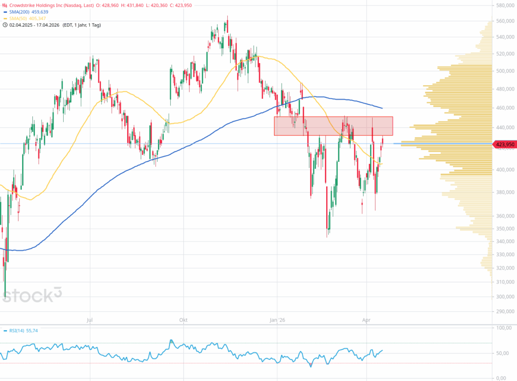 Die Aktie von Crowdstrike zeigt übergeordnet zuletzt keine schöne Price-Action. Der Chart irrt eher richtungslos vor sich hin. Zwischen 433 und 452 USD hat sich dennoch ein gewisser Widerstandsbereich gebildet. An diesem Widerstand ist die Aktie zuletzt mehrfach gescheitert. Bei aktuell rund 460 USD gäbe es noch die 200-Tagelinie zu überwinden.