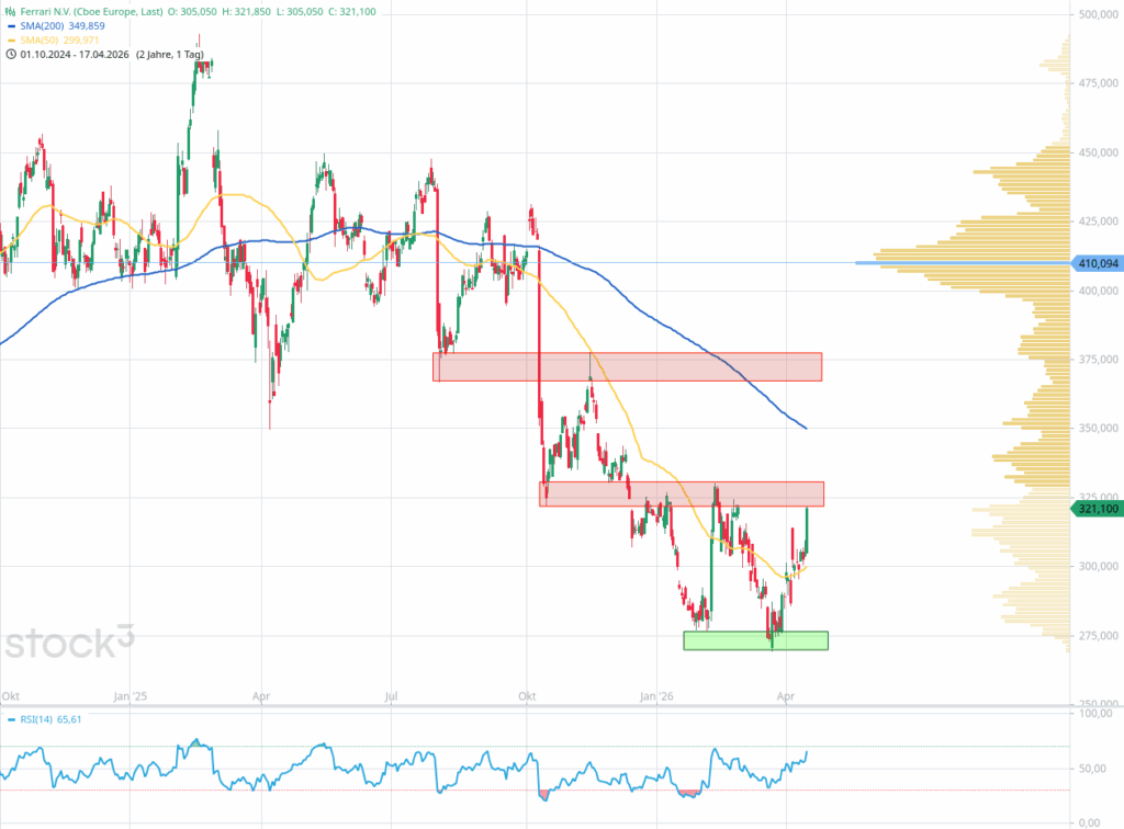 Die Ferrari-Aktie hat im Bereich um 275 USD einen Boden gebildet und ist von hier aus an den nächsten Widerstand zwischen 322 und 331 USD gelaufen. Ein Ausbruch über 331 USD könnte die nachhaltige Trendwende für die Aktie bedeuten – hier würde auch der Abwärtstrend brechen.