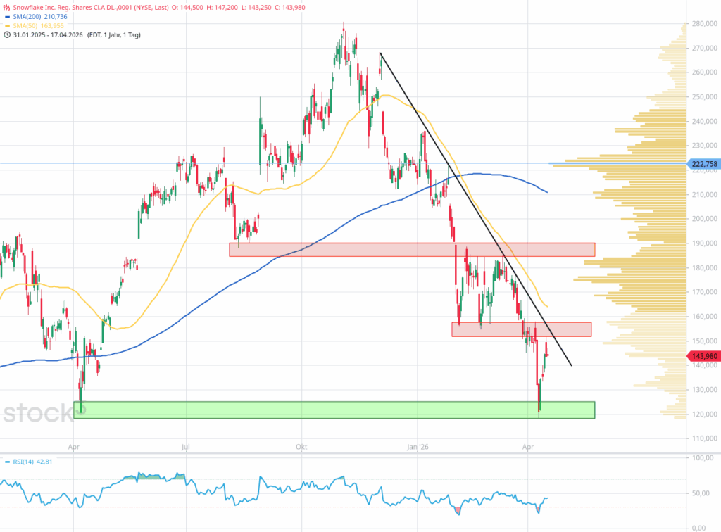 Snowflake befindet sich noch immer im Abwärtstrend und die Aktie respektiert die Abwärtstrendlinie, die sich vom Dezember-Hoch 2025 gebildet hat, sehr sauber. Am April-Tief 2025 bei rund 120 USD hat Snowflake nun reagiert – ist aber am Widerstand zwischen 151 und 158 USD abgeprallt.