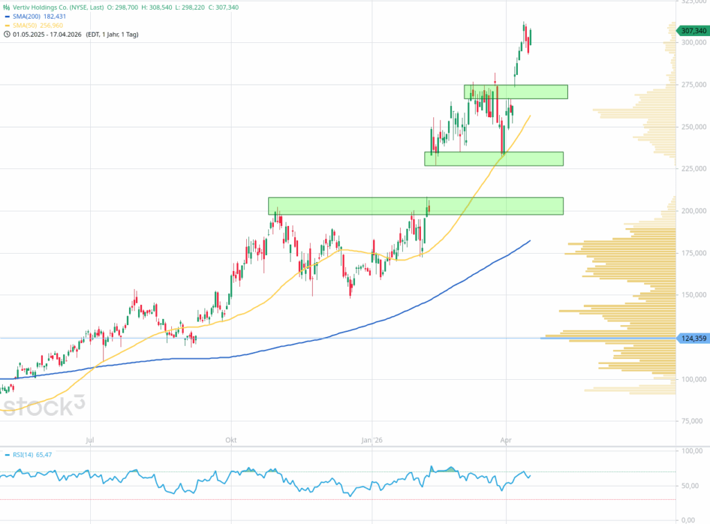 Die Aktie von Vertiv kennt zuletzt nur eine Richtung: steil nach Norden. Der ehemalige Widerstand um die 200 USD-Marke wurde mit einem Up-Gap überwunden und dient nun als mittlerweile sehr weit entfernte Unterstützung. Auch die Kursbereiche um 225 und 275 USD haben einige Relevanz.